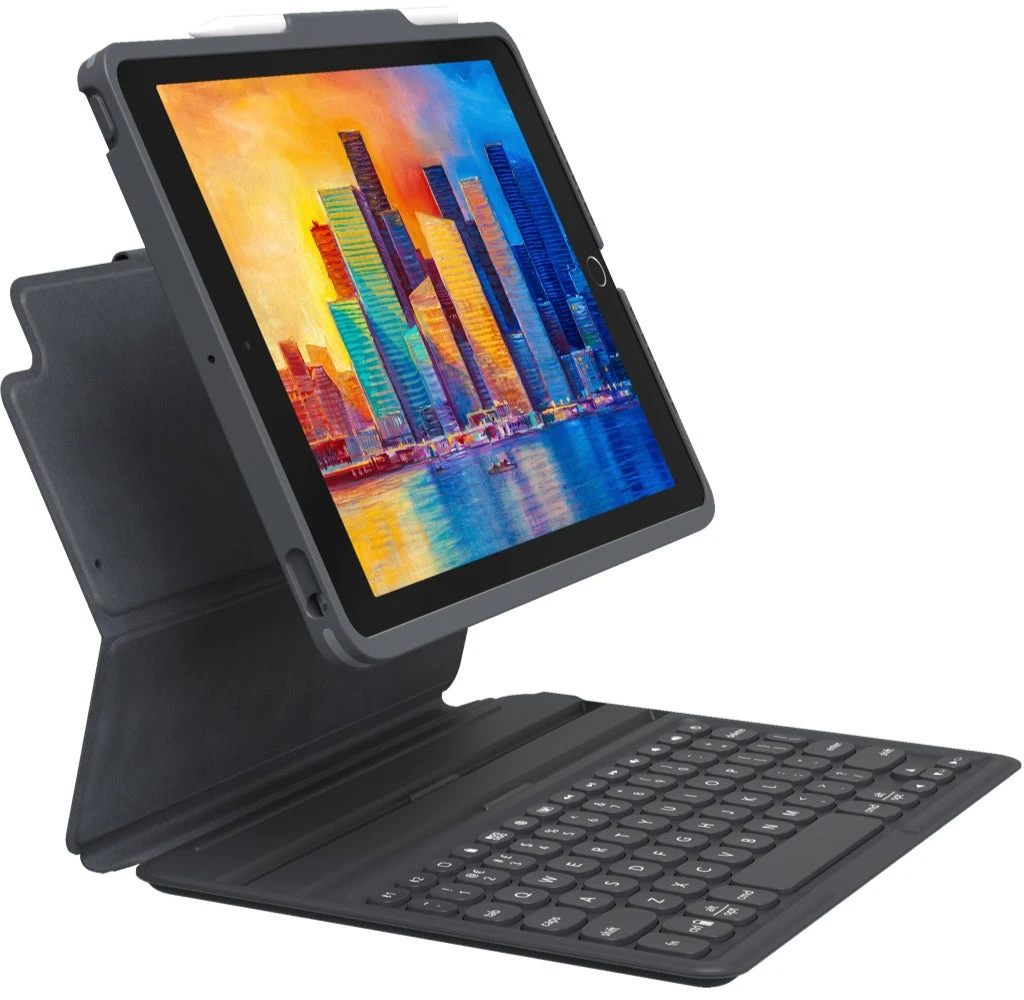 Die ZAGG Pro Keys Tastatur für Apple iPad 10,9″ (Gen 10) verwandelt Ihr Tablet in ein mobiles Produktivitätspaket. Mit einer abnehmbaren, hintergrundbeleuchteten BluetoothTastatur, einer Schutzhülle und der Kopplung mehrerer Geräte können Sie überall arbeiten, wo das Leben Sie hinführt. Diese Tastatur verfügt über Tasten im Laptop-Stil, einen integrierten Apple Pencil-Halter und einen magnetischen Ständer für einstellbare Betrachtungswinkel.